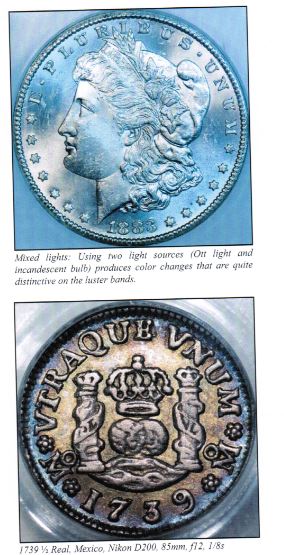 混合光源(燈光加自然光、或者白熾燈加日光燈)是最不可取的。這是因為這些光源的色溫不同,會造成非自然、甚至是怪異的圖像顏色。應盡量避免在混合光源中拍攝錢幣。Mark Goodman的做法是在暗室中拍攝錢幣,或者把厚重的窗簾拉上,以避免自然光和燈光的混合照明。