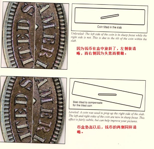 相機設置相機位置 - 從文章開頭的圖上可以看出,Mark Goodman的相機是裝在一個支架上,朝下拍攝的。這樣做的好處,是無須仔細調整相機和錢幣的相對平行位置。在這樣的支架上,相機和錢幣自然是平行的。而且這樣設置也便于調整錢幣角度。這幅圖里幣盒的一端就略有墊高,錢幣和相機形成小夾角。將幣盒一端墊高有兩個原因,一是讓光線反射到相機鏡頭;二是錢幣有時在幣盒中裝斜了,需要墊平。用大光圈時景深短,幣盒里裝斜的錢幣和相機不平行會造成錢幣的一側模糊不清。