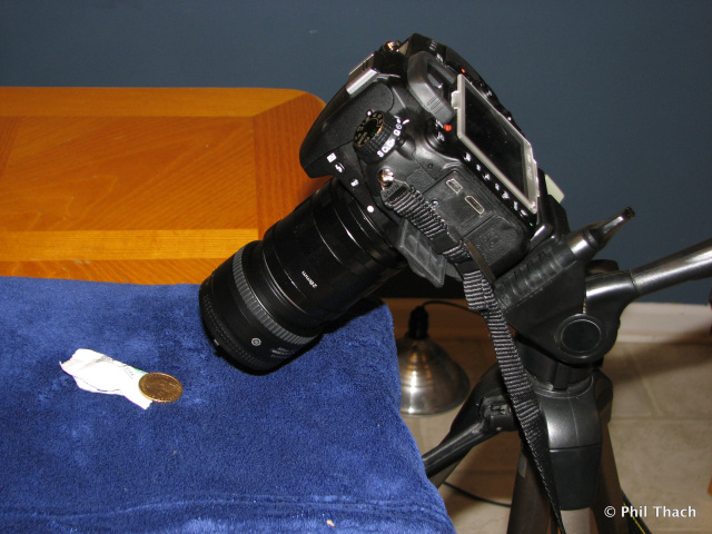 有些三腳架可以向下旋轉90度,讓相機朝下拍攝。就本人的經驗看,這樣放置時三腳架高低調整不易。而且有撐腳擋著,布光麻煩。本人所使用的三腳架無法把相機完全固定,相機垂直向下時仍有松動,造成圖片模糊。相機裝在三腳架上水平方向拍攝應該能夠解決這個相機抖動的問題。使用翻拍支架還是使用三腳架,如何放置錢幣,如何布光等各位幣友可根據自己的情況因地制宜。