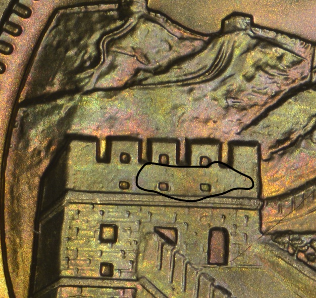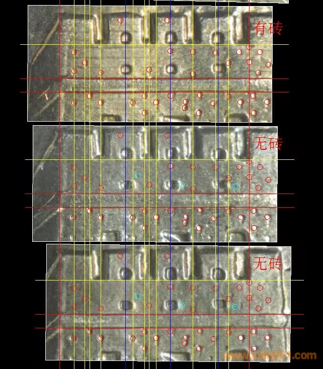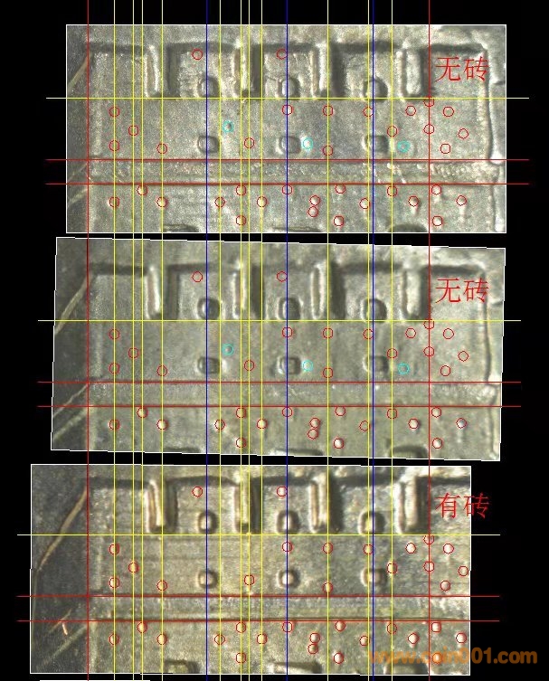看起來,磚墻銜接縫的痕跡位置基本一致。唯一可惜是我的疊圖軟件出了問題,否則能夠更明確兩種版別幣的磚墻銜接縫位置關系。