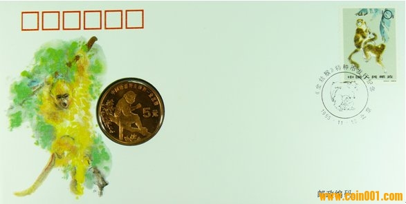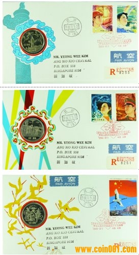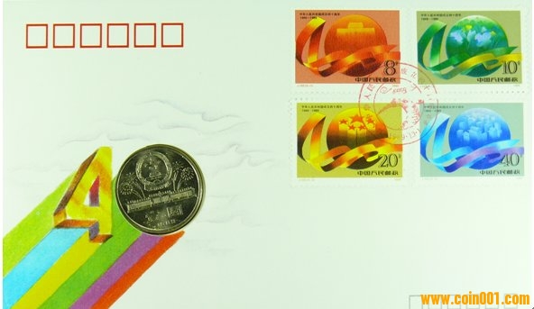 一套3枚,A種貼J.105(5-1,5-2)郵票2枚,內嵌幣為“中華人民共和國成立三十五周年流通紀念幣”華表1枚;B種貼J.105(5-4,5-5)郵票2枚,內嵌幣為“中華人民共和國成立三十五周年流通紀念幣”開國大典1枚;C種貼J.105(5-3)郵票1枚,內嵌幣為“中華人民共和國成立三十五周年流通紀念幣”歌舞1枚,鑲嵌的這套紀念幣為精制紀念幣,所以背面文字有“仿銀”二字,難能可貴。郵幣封設計者:簡宣義、竇東虹。發行日期:1984年10月01日,發行數量:不詳。