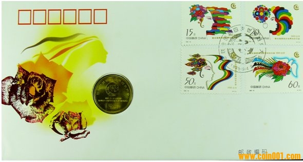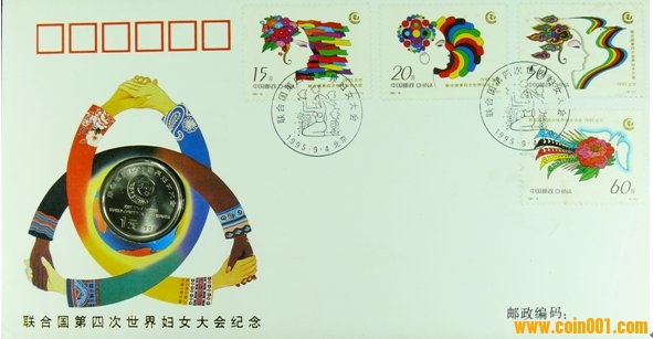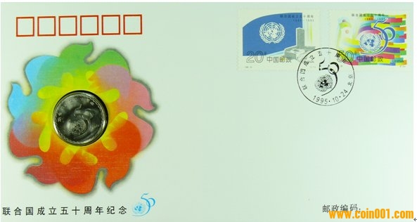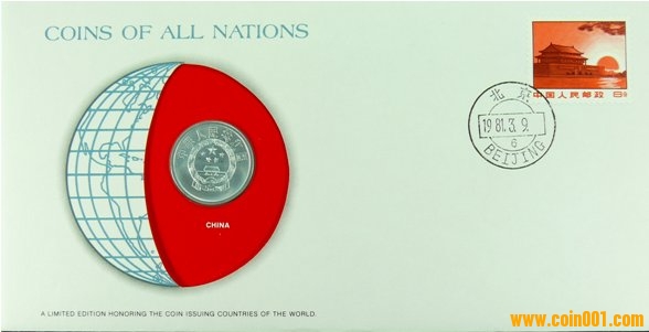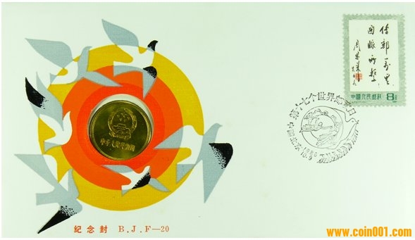 背面文字:為慶祝建國35周年,北京市郵票公司于1984年10月1日發行《中華人民共和國成立三十五周年郵幣封》一套,一共三枚。該封貼J.105《中華人民共和國成立三十五周年》郵票,并鑲嵌中國人民銀行發行的《中華人民共和國成立三十五周年》紀念幣。紀念幣圖案是國徽、天安門廣場、禮花;背面分別為祖國萬歲、各族人民大團結、開國大典。直徑30毫米,重9.4克,仿銀。