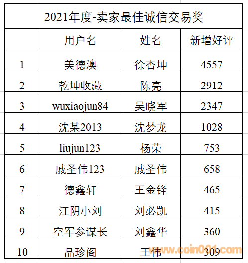 獲獎名單和獎品如下: 買家第1名至第5名: 獎勵現金500元。 買家第6名至第10名:獎勵現金300元。 賣家第1名至第5名: 獎勵現金500元。 賣家第6名至第10名:獎勵現金300元。 考慮到會員隱私問題,買家獲獎名單不進行對外公布。本年度買家前十名獲得好評數量最低為219個,賣家前十名獲得好評數量最低為309個。 網站版主將與獲獎人員進行聯系,獎勵的現金將直接轉入獲獎人員的現代幣賬戶。 現代錢幣網 2022.01.10 |