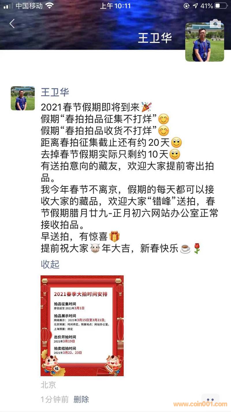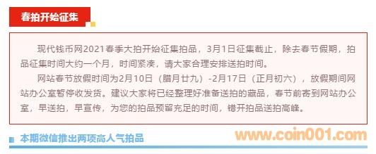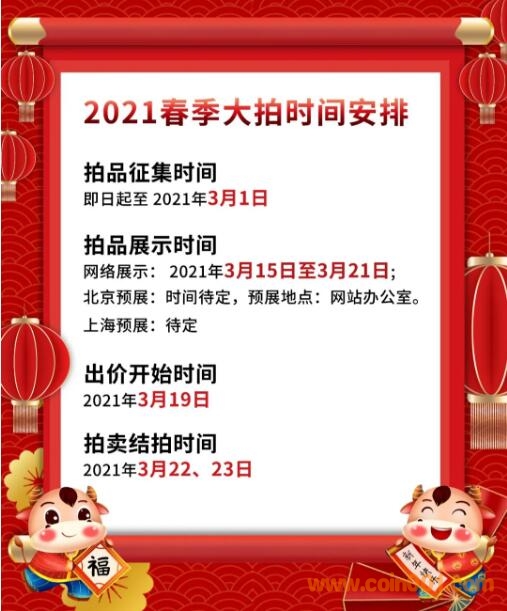 今天北京迎來2021年的第一場雪,瑞雪兆豐年。, 現(xiàn)代錢幣網(wǎng)2021春季大拍即日起開始征集拍品,3月1日征集截止,除去春節(jié)假期,拍品征集時間大約一個月,時間緊湊,請大家合理安排送拍時間。 拍品征集范圍: 中國流通幣、貴金屬幣、紀念章、紙幣、郵票、機制幣、世界錢幣等,評級與不評級均可。評級幣要求為冠、亞軍分,高價值品種可適當放寬要求。 拍品征集途徑: 1、網(wǎng)站會員通過“個人中心”-“簽署委托合同”-“委托春秋大拍合同”進行申請; 2、非網(wǎng)站會員可以通過電話(010-63468408)與網(wǎng)站客服聯(lián)系; 3、網(wǎng)站會員或非網(wǎng)站會員也可直接電話或微信聯(lián)系拍品征集負責人13520838222。 2021春季大拍時間安排: 拍品征集時間:即日起至 2021年3月1日。 拍品展示時間:網(wǎng)絡展示 2021年3月15日至3月21日; 北京預展:時間待定,北京展示地點:網(wǎng)站辦公室。 上海預展:待定。 出價開始時間:2021年3月19日 拍賣結拍時間:2021年3月22、23日 期待疫情早日結束,祝愿廣大藏友新的一年里收藏大豐收。