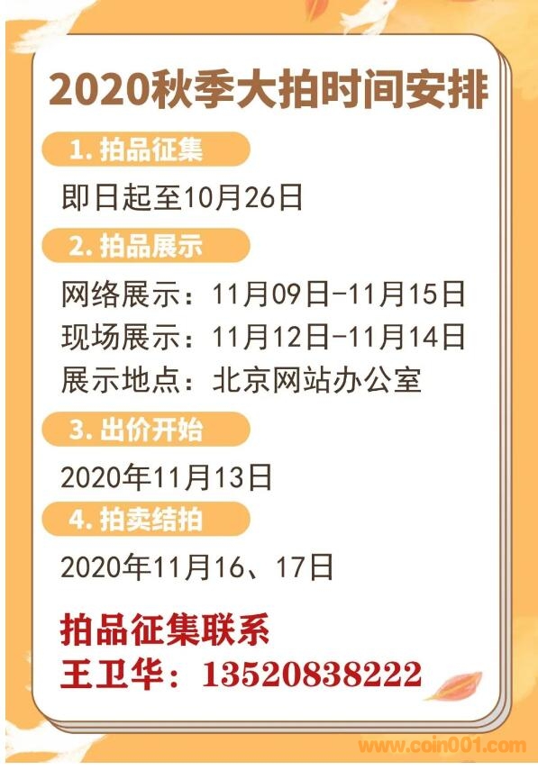 2020秋季大拍即日起開始征集拍品,10月26日征集截止,拍品征集時間緊湊,請大家合理安排送拍時間,早送拍,早宣傳。 拍品征集范圍: 中國流通幣、貴金屬幣、紀念章、紙幣、郵票、機制幣、世界錢幣等,評級與不評級均可。評級幣要求為冠、亞軍分,高價值品種可適當放寬要求。 拍品征集途徑: 1、網(wǎng)站會員通過“個人中心”-“簽署委托合同”-“委托春秋大拍合同”進行申請; 2、非網(wǎng)站會員可以通過電話(010-63468408)與網(wǎng)站客服聯(lián)系; 3、網(wǎng)站會員或非網(wǎng)站會員也可直接電話或微信聯(lián)系拍品征集負責人13520838222。 2020秋季大拍時間安排: 拍品征集時間:即日起至 2020年10月26日。 拍品展示時間:網(wǎng)絡展示 2020年11月09日至11月15日; 現(xiàn)場展示2020年11月12日至11月14日, 展示地點為北京網(wǎng)站辦公室。 出價開始時間:2020年11月13日 拍賣結拍時間:2020年11月16、17日 現(xiàn)代錢幣網(wǎng) 2020.09.10 |