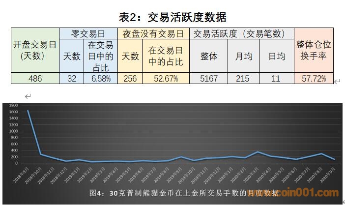 ??????1.兩年來共有486個交易日,其中30克普制熊貓金幣沒有實現(xiàn)交易的共有32天,占比6.58%;夜盤沒有實現(xiàn)交易共有256天,占比52.67%。