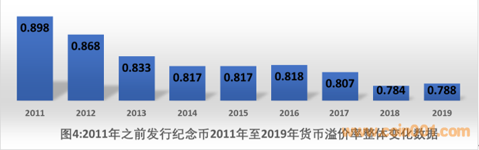 2011年至2019年正是我國金幣市場的熊市區間。有人一定會問在這個“特定研究區間”板塊內,貴金屬紀念幣貨幣溢價率的變化是否與金幣市場的熊市密切相關?圖4是“1979年至2010年發行貴金屬紀念幣”的貨幣溢價率在2011年至2019年的變化數據。