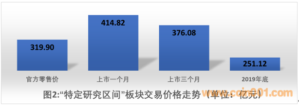 如圖2所示,在這個板塊內幣種上市時的市場價總值414.82億元,與官方零售價相比高出29.67%;三個月后回落了9.34%,下行到376.08億元;到2019年底時市場價總值為251.12億元,與上市時的高點相比下降了39.46%,同時低于零售價總值21.50%。