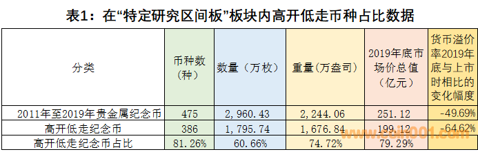 2.從表1的數據中可以看到,在“特定研究區間”板塊內,“高開低走”幣種在幣種總數、總數量、總重量和市場價總值中的占比分別達到81.26%、60.66%、74.72和79.29%,已經成為這個板塊的主體和交易價格變化的最突出特點。