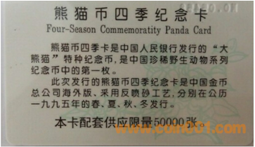 此次發(fā)行的熊貓幣四季紀(jì)念卡是中國金幣總公司海外版,采用反噴砂工藝,分別在1995年的春、夏、秋、冬發(fā)行。