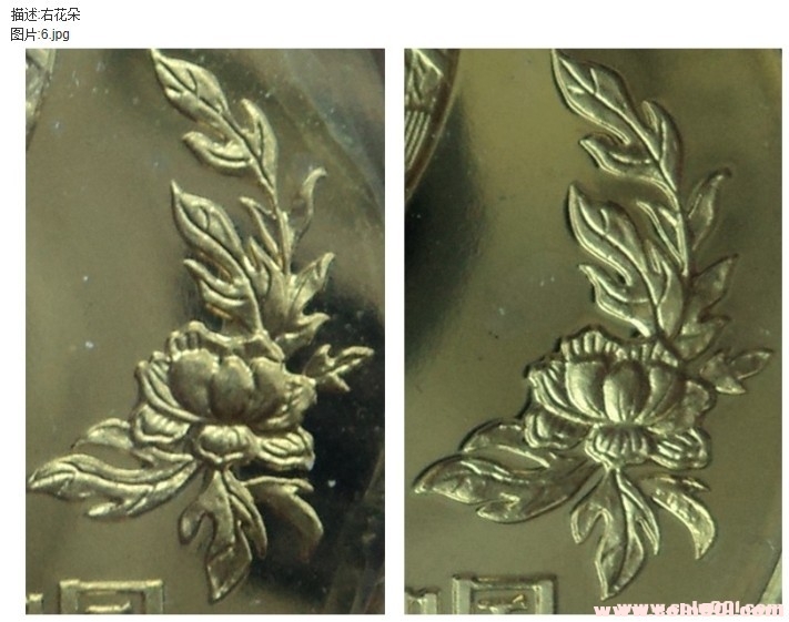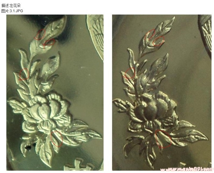 另外,根據江蘇劉必凱等幾位藏友較早之前的觀察研究結果,對比多枚銅足發現,在幣的背面國徽下牡丹花(?)葉子及花瓣確實存在有較大的差異,但是即使找出相關特征,但由于不是原版拆出,其差異歸屬探源也難以區分!