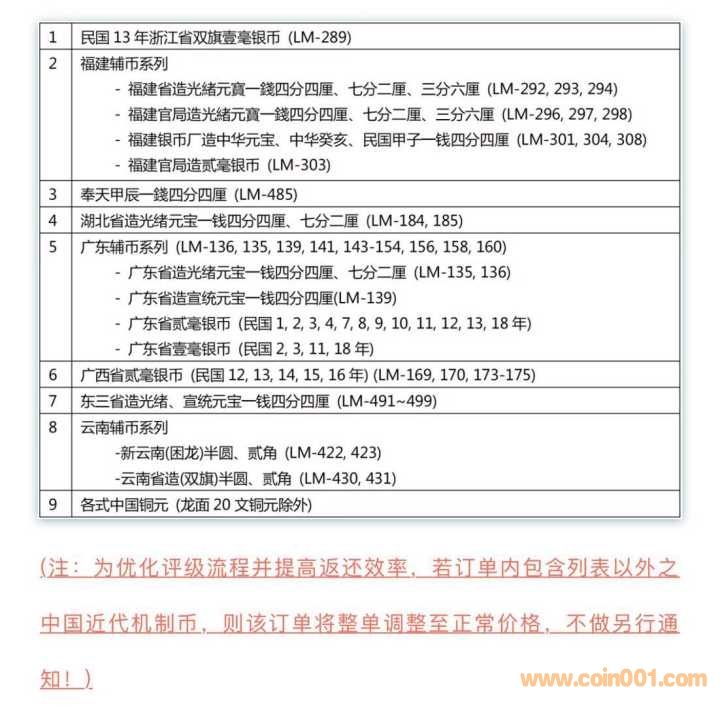 為了迎合廣大藏家需求,PCGS致力于提升評級質量,并提高返還效率。針對中國近代機制幣部分,本次優惠活動將限定以下九項送評種類,如下表所示。