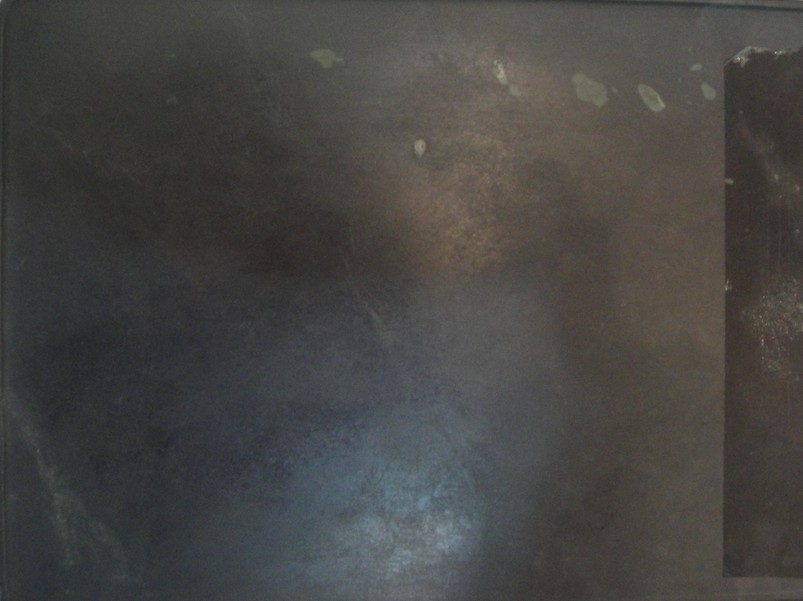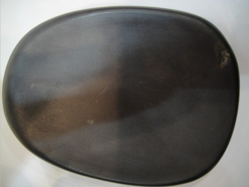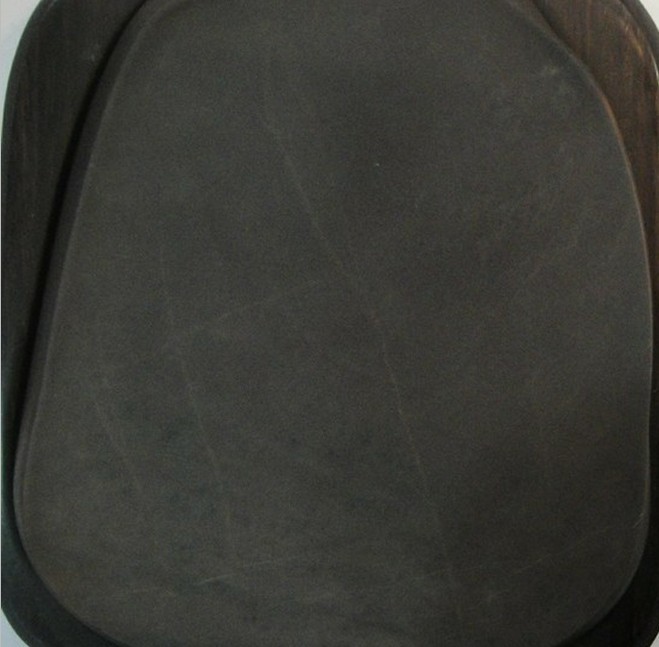 以上是這方老坑大西洞端硯標本,此硯名紫云,為老坑大西洞八十年代中期開采出石料所制。正面如石眼和飄帶紋的地方稱之為翡翠紋、翡翠印,也就是近似于要形成眼的東西。而此硯背部右上方一塊似疤痕狀的物體在端硯里面稱之為五彩釘,這也是老坑石硯的重要標志之一。因為其它無論是麻子坑還是坑仔巖等諸多坑口都沒有五彩釘的出現。