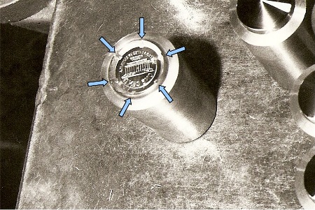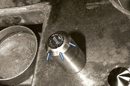 這幅照片顯示了用于壓印林肯分幣背面的二元模。如果您仔細觀察,就會發現二元模表面的圖案是陽紋,和壓印完成的錢幣上的圖案一樣。箭頭所指之處是二元模邊緣的凹槽。如果要多次翻模,工作模上的凸起部分將嵌入這些凹槽,保證二元模和工作模精確對正,在制作的陽模或陰模上做出滿意的圖案。