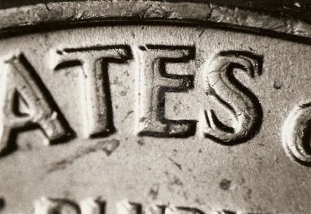 在 STATES 一字中第二個 S 的頂部和底部都出現了明顯的開裂襯線。另外注意 T 和 E 頂部邊角上明顯的刻痕。該重影發生在1964 林肯分幣上。