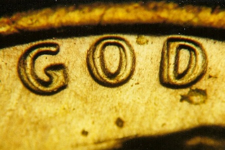此處的重影出現在 1972 年林肯分幣重模版別上。請注意在GOD一字中,重復的圖案是凸出而圓滑的,和正常字母一樣。