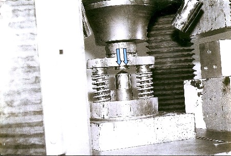 在此可以看到一個多次擠壓翻模壓機的翻模腔。箭頭指的是鎖定在翻模腔頂部的二元模。一個尖部為錐形的模坯位于二元模的正下方。照片由 Arnold Margolis 和 Error Trends Coin Magazine 友情提供。