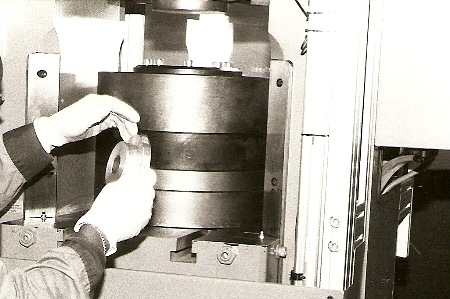 翻模壓機操作工正在將一個套圈放入翻模壓機。翻模開始前,陰模模坯和二元模將被手工放入套圈的內筒。首先會放入工作模,使其錐形頂端朝上。而二元模將被放在工作模上面,其圖案與工作模的錐形尖部相接觸。