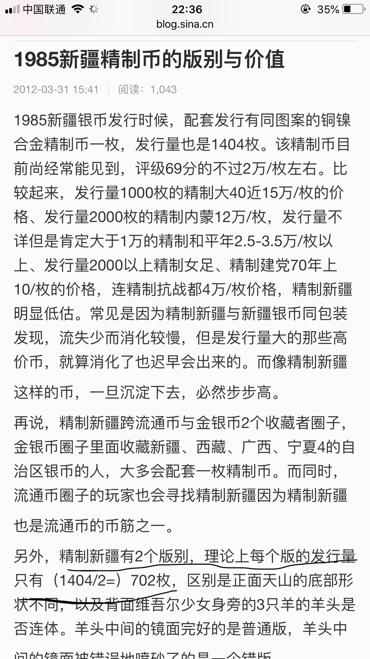 1新疆幣有瘦羊和肥羊肥羊顯然是 模具長時間制作損傷造成的,收藏無可厚非,但是恰恰證明了 模具損傷的問題。顯然精制幣是后做的。只要是2000以后突然出現的精制幣消息和種類 我相信 就是后座的 而不是當年制造的。