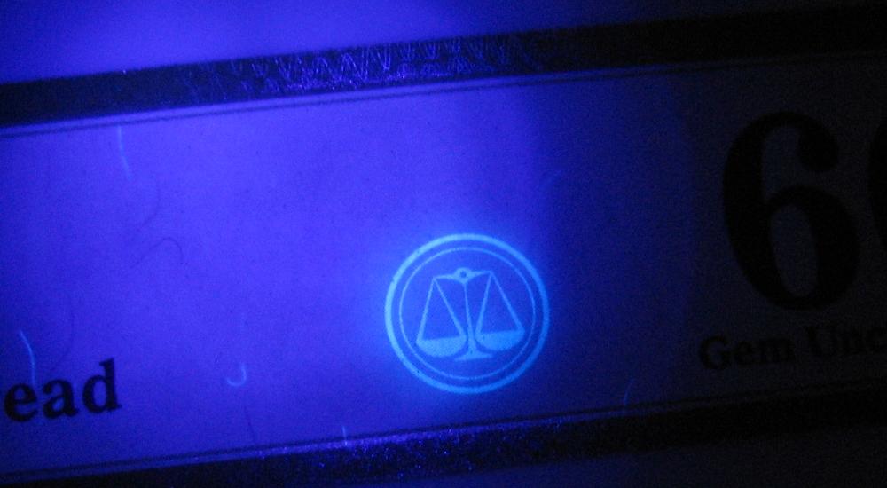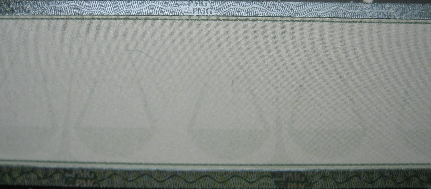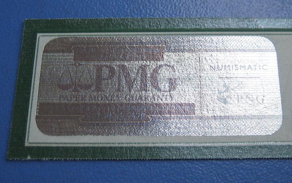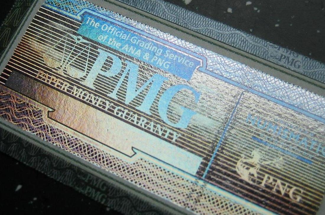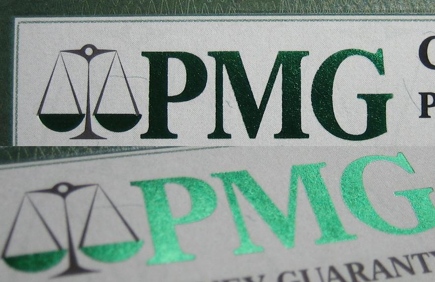 PMG評(píng)級(jí)紙幣標(biāo)簽的正面左側(cè),用光變油墨印刷“PMG”字樣和天平形狀的標(biāo)志,垂直視角下為灰黑色,傾斜視角下為綠色。這種防偽措施大家應(yīng)該很熟悉了,在目前流通的五版紙幣正面左下角就有,是一般大眾鑒別大額紙鈔時(shí)的常借助的手段。