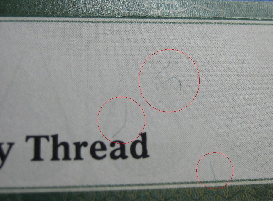 PMG標(biāo)簽紙中夾有彩色纖維,每條長(zhǎng)度都在幾毫米左右,隨機(jī)分布在紙張各個(gè)部位。這是一個(gè)很老舊的防偽措施,上世紀(jì)初就應(yīng)用在鈔票上了。人民幣紙幣最早是在1999年版100元上使用了它。后來(lái)這個(gè)防偽措施在2005版紙幣上取消了,代之以反復(fù)印的圓圈星座圖。
