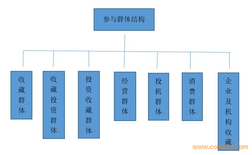 我國的金幣市場已有近四十年發展歷史,在需求側中參與這個市場的群體結構復雜多樣。按照參與者不同的入市目的,從概括和簡化分析的視角出發,其中至少可以分為如下圖所示的七類群體。
