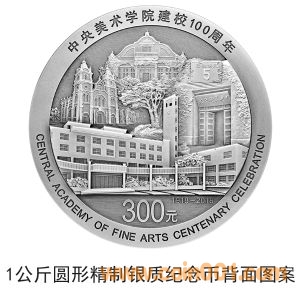 1公斤圓形銀質紀念幣背面圖案為中央美術學院歷史建筑和標志性建筑,輔以“校尉胡同5號”門牌等元素組合設計,并刊“中央美術學院建校100周年”中文字樣、“CENTRAL ACADEMY OF FINE ARTS CENTENARY CELEBRATION”英文字樣、“1918-2018”及面額。