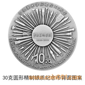 30克圓形銀質紀念幣背面圖案為中央美術學院代表學科典型工具及校徽等元素組合設計,并刊“中央美術學院建校100周年”中文字樣、“CENTRAL ACADEMY OF FINE ARTS CENTENARY CELEBRATION”英文字樣、“1918-2018”及面額。