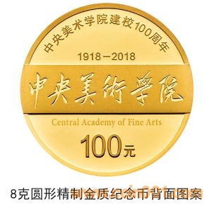 8克圓形金質紀念幣背面圖案為“中央美術學院”匾額及英文校名組合設計,并刊“中央美術學院建校100周年”中文字樣、“1918-2018”及面額。