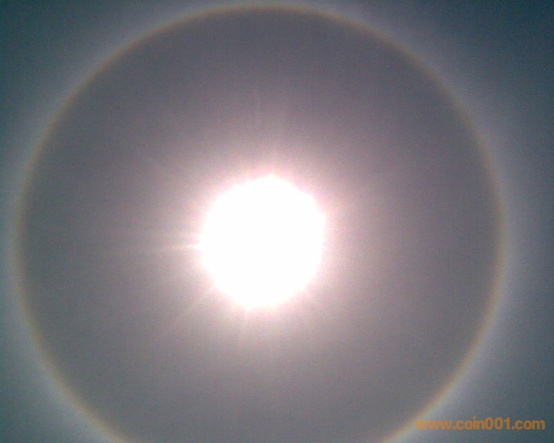 暈(Yùn),是由于懸浮在大氣中的冰晶把太陽光或月光折射或反射而形成的光學(xué)現(xiàn)象。當(dāng)光線射入卷層云中的冰晶后,經(jīng)過兩次折射,分散成不同方向的各色光。有卷層云時,天空中會飄浮著無數(shù)冰晶,在太陽周圍同一圈上的冰晶,都能將同一種顏色的光折射到我們的眼睛里形成內(nèi)紅外紫的暈環(huán)。天空中有冰晶組成的卷層云時,往往在太陽周圍出現(xiàn)一個或兩個以上以太陽為中心、內(nèi)紅外紫的彩色光環(huán),有時還會出現(xiàn)很多彩色或白色的光點和光弧,這些光環(huán)、光點和光弧統(tǒng)稱為暈。