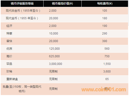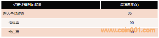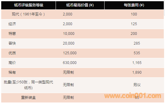 所有服務等級均包含金盾服務。樣票、試模票、試樣票和其他未列入主要目錄(如世界紙鈔目錄,Friedberg,Haxby,Criswell等)的紙幣必須使用特惠或以上服務等級。錯體票和錢莊票必須使用特惠或以上服務等級。