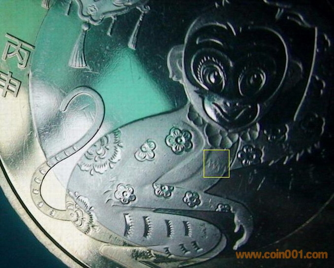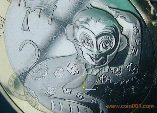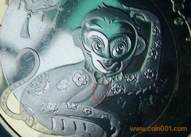 一、“波紋”防偽圖案,雕鑄清晰而規范。用10倍以上放大鏡即可清楚辨識(甚至用肉眼也可觀察到模糊圖案)。在首批上市的沈陽、上海兩廠所鑄猴幣左胸部位,均有“波紋”圖案。這說明,“波紋”圖案必須是被設計在原模上的,而不是個別工作模或軋幣過程中偶然造成的個別現象。“波紋”圖案是為了進一步加強猴幣的防偽功能。