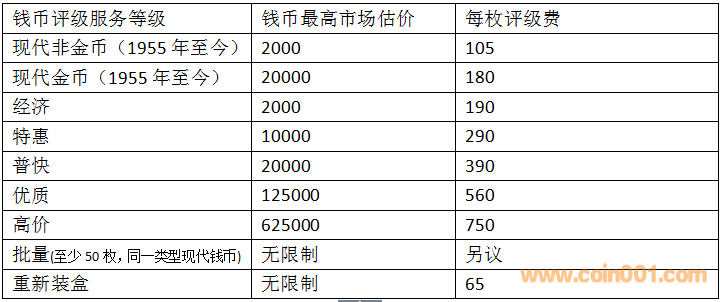 PCGS根據送評錢幣的年份與市場估價,對收取評級費劃分了幾個服務等級,符合相應服務等級的錢幣,收取相應服務等級的評級費。如下:
