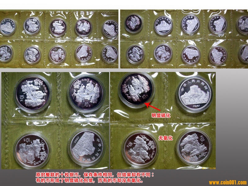 周衛榮說,銀幣腐蝕,原因比較清楚,因為白銀本身就易受腐蝕,因此,我們只是用上述方法做了簡單的分析,檢測結果:褐色銹蝕物為銀的氧化物和硫化物;白斑為氯化銀。氧化銀、硫化銀,主要由空氣中的腐蝕性物質反應生成;氯化銀主要由包裝材料分解物腐蝕生成。另外,電化學腐蝕發生時會與空氣中的顆粒物質形成多種化合物,因而表面往往呈現多種色彩。這些也從金銀幣的儲藏環境即包括包裝材料和周圍環境氛圍(空氣)的檢測中得到了印證。在對金銀幣的內外包裝材料檢測時,發現現行金銀幣的貼身包裝(軟硬兩種)為聚氯乙烯材料制成,而聚氯乙烯具有腐蝕性;現代都市,隨著工業化程度的提高和汽車擁有量的與日俱增,空氣污染也比較嚴重,環境空氣中較高濃度的有害氣體(腐蝕性氣體)的存在,同樣會對金銀幣產生腐蝕作用。
