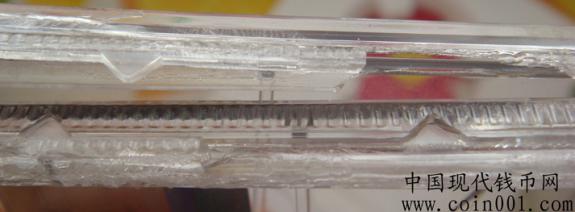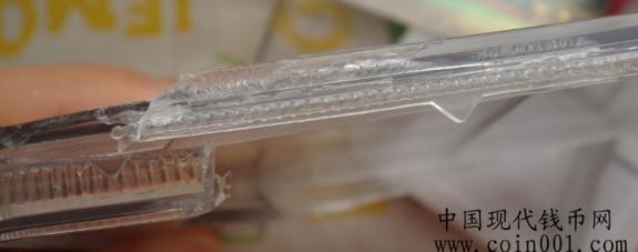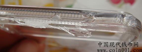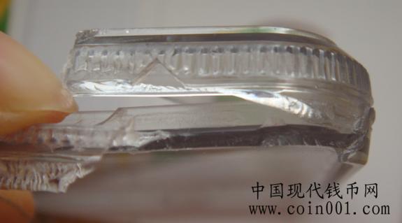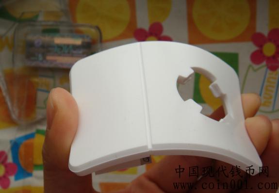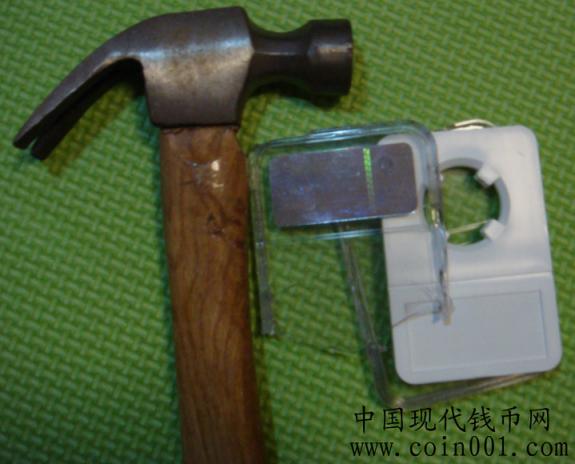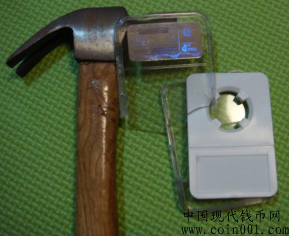 用這個錘子砸了十幾下,才砸開,很結實,找不到膠水粘的痕跡,估計是什么高科技局部熱合的,里面的固定架是一體的,軟的,可以把幣輕松塞進去,標簽就是浮擱著,沒粘。
