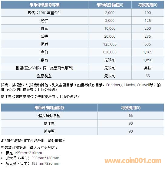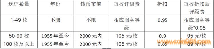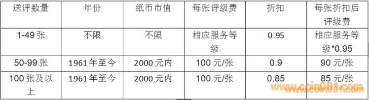 2)一次送評錢幣(紙幣)滿100枚(張),品種不限,即享受評級費8.5折折扣。