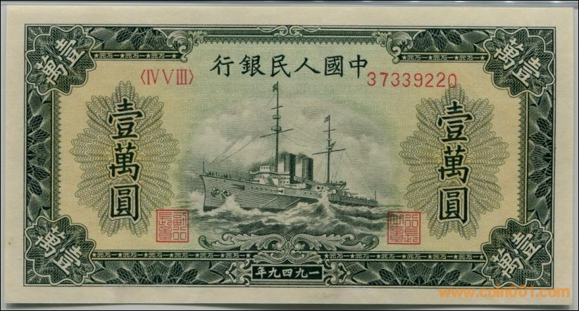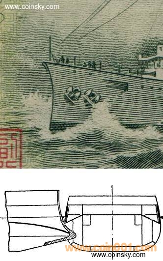 第一套人民幣紙幣中的壹萬圓軍艦券 主色調:黑綠色、棕色; 標準規格:140×75毫米; 制版年份1949年; 單面凹印工藝,由北京印鈔廠生產。 這幾年,三四版紙幣流行炒作設計原型,某某拖拉機手,某某講解員之類的,確切的論據恐怕沒有,宣傳目的多半還是為了炒作獲利。 筆者是海軍家庭出身,雖然自己沒入過伍,但對海軍題材還是挺有興趣的。一萬元軍艦券的圖案設計原型筆者關注好幾年了,也曾經在本版發過征求原型信息的帖子,沒得到過什么確切證明。倒是通過海軍史學家和艦船年鑒資料的幫助,有了很大的收獲。今天在現代錢幣網發出這個帖子,筆者不敢說自己的論證絕對準確,但也絕對不是信口開河。請泉友們中途不要激動,要噴也要等看完了再噴,謝謝。 要探析軍艦券的設計原型,首先要確保它確實有原型,而不是北京印鈔廠的設計師隨便亂畫的。 筆者認為一萬元軍艦圖確有真實的軍艦照片或圖畫作為參考,因為它實在是太寫實了。對航海和艦船有了解的朋友一定看得出,這艘船畫得非常有細節,雖然不是每一處都精確,但各個部位沒有一處本質錯誤或者彼此沖突的。北京印鈔廠的設計師恐怕不會是海軍或者艦船設計師出身,如果讓他們憑空想畫出這么一幅圖,要達到這個效果,簡直是天方夜譚。 從美術工作者的角度來考量,筆者認為這幅軍艦圖的外圍輪廓,也就是艦艏、主炮塔、上層建筑、桅桿、煙囪、艦艉這些部位的形狀,一定是符合參考原型的。這些位置在照片(圖畫)上的背景是淺色的天空,即使沖印效果一般,大體形狀也不難辨認。要知道,素描是美術工作者的基本功,哪怕設計者對軍艦是外行,照貓畫虎也不至于畫得太離譜。 而軍艦舯部的起重吊桿、吊艇架、小艇,船體側面的舷窗和速射炮的炮郭,這些部件在軍艦上要么布置雜亂,要么數量眾多,再加上它們夾雜在船體深色背景里,不容易通過照片圖畫辨認,所以紙幣設計者很可能對這些位置做了一定刪改簡化,造成局部細節失真。這些部件不應作為我們查找軍艦原型的主要依據,只能當做輔助參考。 |