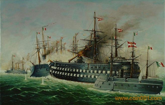 注:利薩海戰:1866年6月,普魯士王國與奧地利帝國之間為爭奪德意志各邦國的領導權發生戰爭。7月,普魯士的盟友意大利派出艦隊圍攻奧地利設在亞得里亞海利薩島上的基地。奧地利隨即派出由海軍少將馮?特格特霍夫率領的一支艦隊前往支援守島部隊。7月20日拂曉,利薩海戰爆發,特格特霍夫將奧地利艦隊排成三層V字沖擊陣型,攔腰切斷意大利艦隊的松散一字型縱隊,使海戰演變成一場犬牙交錯的混戰。雙方的艦炮對射都未能取得明顯成效,但奧地利戰艦用船艏沖角發起的撞擊戰術大獲成功,連續撞沉包括意軍旗艦 “意大利號”在內的三艘鐵甲艦,迫使意大利艦隊敗退,解除了利薩島之圍。
