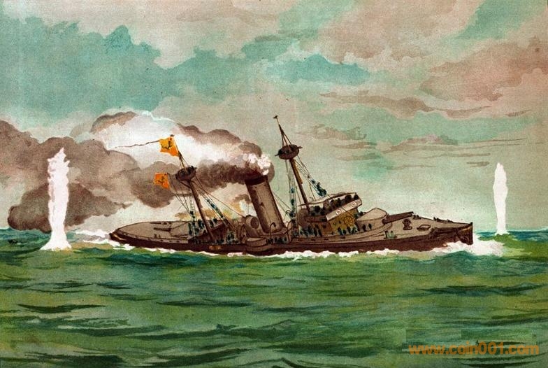 利薩海戰是歷史上首次在蒸汽機鐵甲艦之間發生的海戰,引起了各國海軍的強烈關注,對此后數十年間的海軍戰術起了很重要的影響。奧地利艦隊的V字沖擊陣型被很多國家效仿,艦艏沖角成為各國海軍戰艦的必備裝備,一直流行到20世紀初。在1894年的黃海大東溝海戰中,中國北洋水師效仿了奧地利海軍的V字陣型,試圖沖擊切斷日本海軍的一字型縱隊,但因艦隊機動性和速射炮火力的雙重劣勢,未能實現目的。這次海戰中,鄧世昌指揮致遠號巡洋艦脫離隊列,向日軍本隊發起單艦沖鋒,試圖撞擊日軍旗艦松島號右舷,途中戰艦因在炮戰中受創過重,發生大爆炸而沉沒。從此,沖角戰術在世界范圍內走向沒落,再也未能在實戰中取得戰果。 日本海軍若林欽大尉的戰場速寫——致遠艦的最后沖鋒: (致遠艦嚴重傾斜即將沉沒~請注意吊艇架是空的,沒有救生艇。鄧世昌在開戰前已經下令把救生艇全部扔掉了。) 沖角戰術終歸只是曇花一現。在科技的推動下,線膛火炮技術和光學觀測瞄準技術很快就發生了飛躍式的進步。到19世紀末,新式線膛炮已經能夠在幾千米到十幾千米距離上擊中敵船并穿透其裝甲,于是遠距離炮戰重新成為海戰的主流形式。而蒸汽動力的成熟又大大提高了戰艦的速度和機動性能,追上敵船用沖角撞擊的戰術變得日益不現實,于是戰艦的沖角再次走向沒落,最終于20世紀20年代消亡。適合與沖角搭配的垂直型艦艏由于具有結構簡單堅固,便于制造等優點,又繼續在軍艦上使用了一段時間,后來被適航性更好的飛剪型、雙曲線型等新式艦艏取代。 綜上可見,一萬元軍艦圖紙幣上這艘戰艦的“垂直型艦艏”,流行的時間相當之長。從1860年代到1920年代,這種艦艏是歐美海軍大中型戰艦的標準配置,整整流行了一甲子。這六十年在海軍史上跨越了蒸汽機鐵甲艦、前無畏型戰列艦、無畏/超無畏型戰列艦三個技術時代,使用這種艦艏的軍艦足有上千艘。要想探尋軍艦圖的原型,我們還需要進一步核對軍艦圖上其它細節特征,縮小搜索范圍才行。 筆者在紙幣原圖上繪制的艦艏沖角: [ 此帖被xw781113在2017-07-04 10:21重新編輯 ]