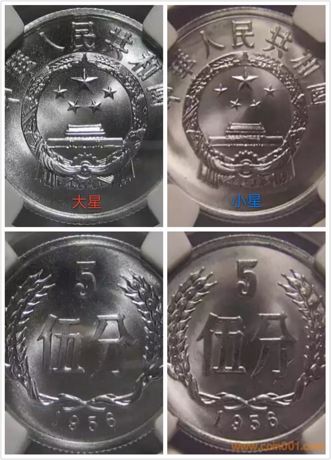 1. 為什么研究56-5大小星分幣國徽上的大小星現(xiàn)象在流通幣和流通紀(jì)念幣上普遍存在,已經(jīng)引發(fā)了硬幣收藏者的關(guān)注。56年5分的大小星現(xiàn)象早已廣為人知,并且作為版別得到了評(píng)級(jí)公司的認(rèn)可,類似得到評(píng)級(jí)公司認(rèn)可的還有 82-5 精制幣。平版分幣和凸版分幣上大小星的區(qū)別也是分幣藏友的常識(shí),甚至有藏友用大小星來辨別造幣廠:大星版由沈陽造幣廠生產(chǎn),而小星版由上海造幣廠生產(chǎn)。最近現(xiàn)代網(wǎng)李祥先生在老西藏紀(jì)念幣的國徽面上亦發(fā)現(xiàn)了大小星的區(qū)別(