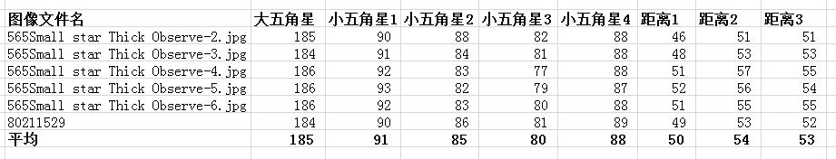 圖三 中心距測(cè)量結(jié)果從這些數(shù)據(jù)可以看出,在這三個(gè)版別中,大五角星與各小五角星之間、各個(gè)小五角星之間的中心距離都相等,大小星版別之間沒有差別。這樣就排除了縮刻機(jī)把圖案整體縮小,從而造成小星的可能性。