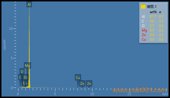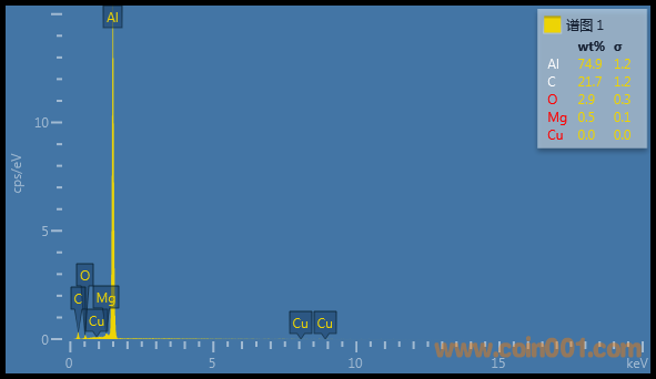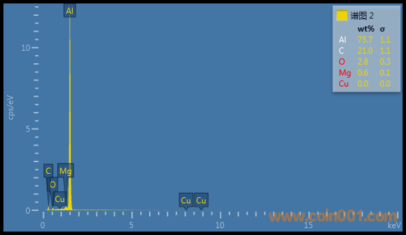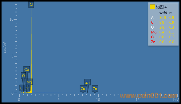 因為圖譜反映的是金屬幣表面的成分,有氧化層所以導致測量的O和C含量過高。建議更嚴謹的方法是做破壞性試驗,切割硬幣內層金屬進行分析。