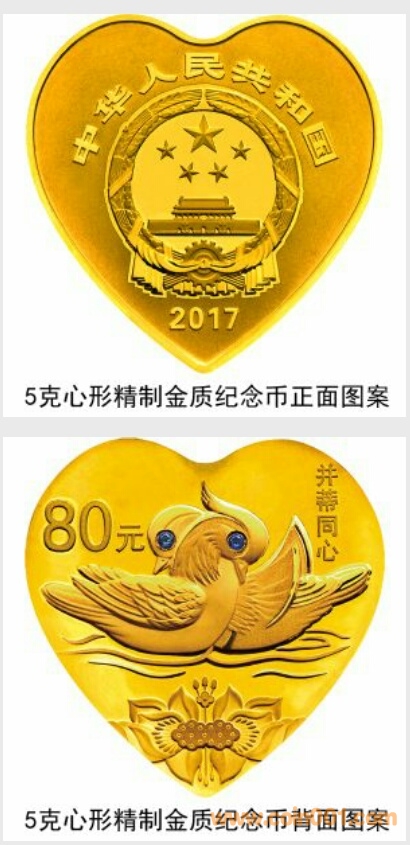 5克心形金質、30克心形銀質“并蒂同心”紀念幣(5月18日發行)背面圖案均為交頸鴛鴦、并蒂蓮花等造型組合設計,并刊“并蒂同心”字樣及面額。