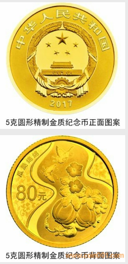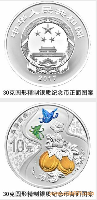 5克圓形金質、30克圓形銀質“瓜瓞綿綿”紀念幣(4月20日發行)背面圖案均為瓜、藤蔓、蝴蝶以及葫蘆圖形,襯以纏枝紋樣組合設計,并刊“瓜瓞綿綿”字樣及面額。