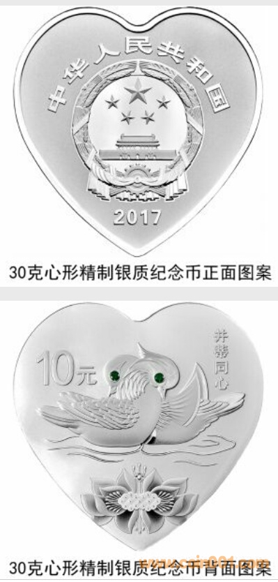 30克心形銀質紀念幣為精制幣(1枚),含純銀30克,外接正方形邊長40毫米,面額10元,成色99.9%,最大發行量1×60000枚。