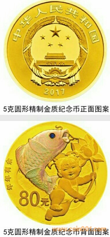 5克圓形金質、30克圓形銀質“年年有余”紀念幣(6月19日發行)背面圖案均為持蓮女童、鯉魚造型,襯以云水紋樣組合設計,并刊“年年有余”字樣及面額。