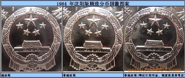 這里我舉一個簡單的列子,下面的圖片我選用了3張圖片(沈陽版1984年精致1分),通過圖片大家可以發現雖然3分精致分幣底板不同,但是壓印的效果幾乎沒有明顯的差異,考慮到沈陽版的精致套裝官方的發行數量: 5750套,通過一些細節的觀察我猜測1984年的精致分幣使用的是中晚期的工作模