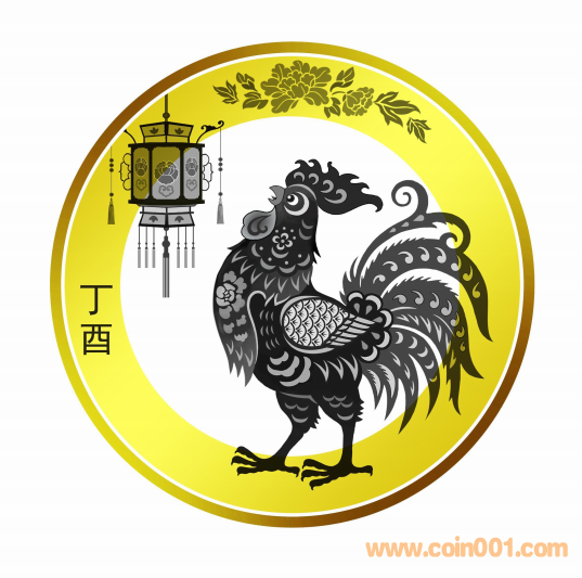 背面主景圖案為一只中國(guó)傳統(tǒng)剪紙藝術(shù)與裝飾年畫元素相結(jié)合造型的公雞,其上方為宮燈和牡丹圖案,幣面左側(cè)刊“丁酉”字樣。