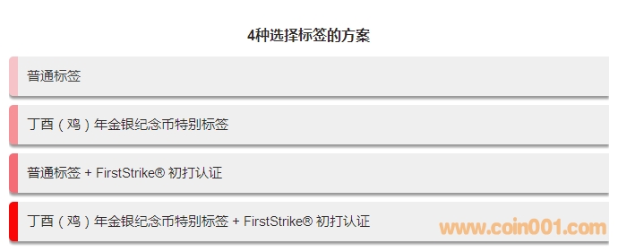 填寫申請若您選特別標簽或FirstStrike? 初打認證,需要在填寫的送評表上注明選擇哪一款標簽,例如標注“丁酉(雞)年金銀紀念幣(紅色款)+ First Strike? 初打認證”。