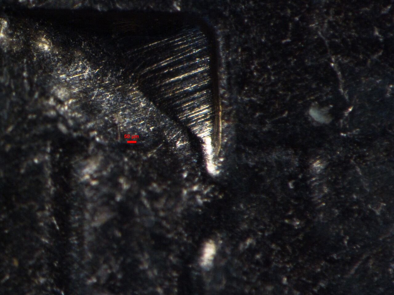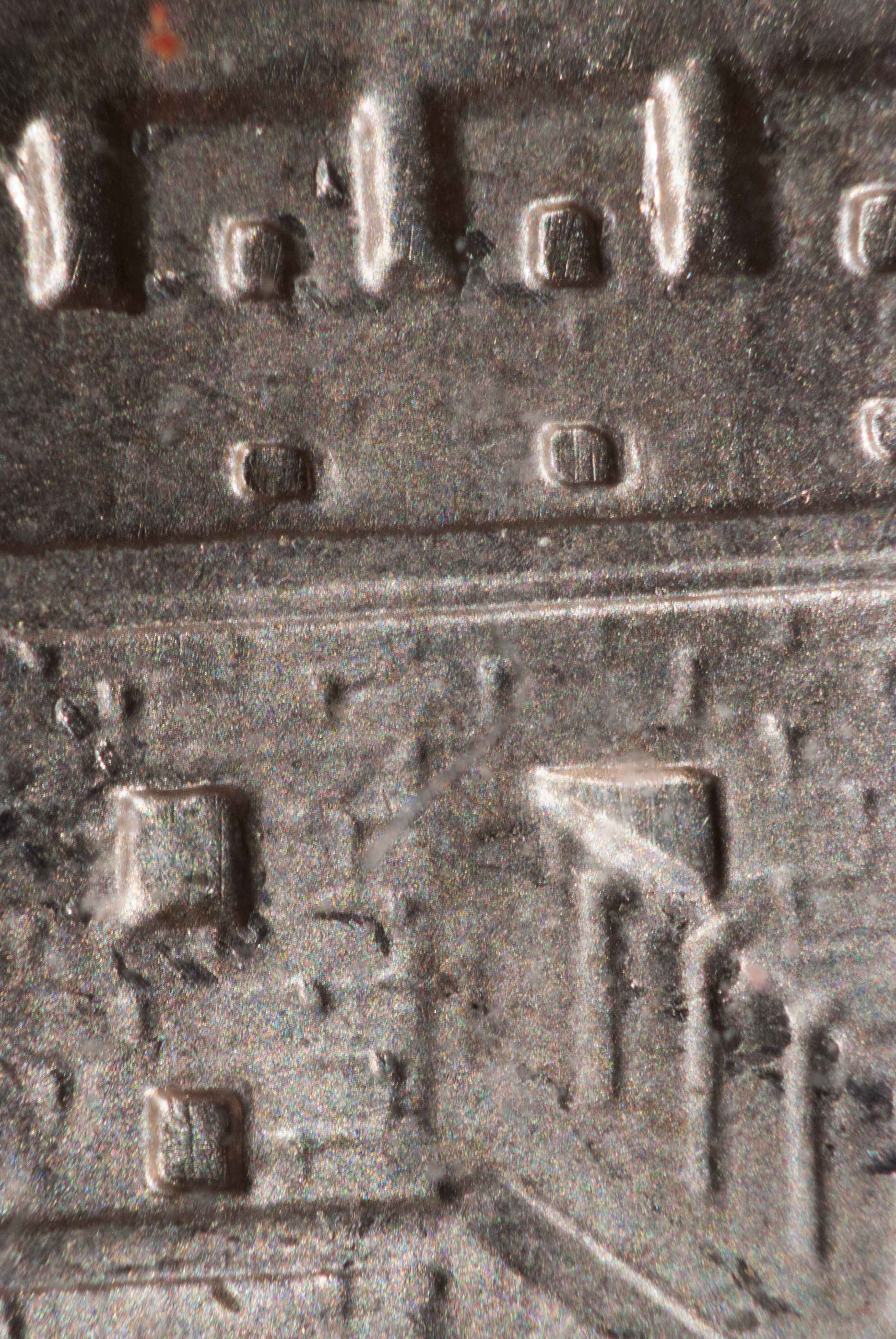 圖8:小黑本長城幣正面第一個烽火臺三角形射孔放大圖,斜邊處有很寬的模具痕跡